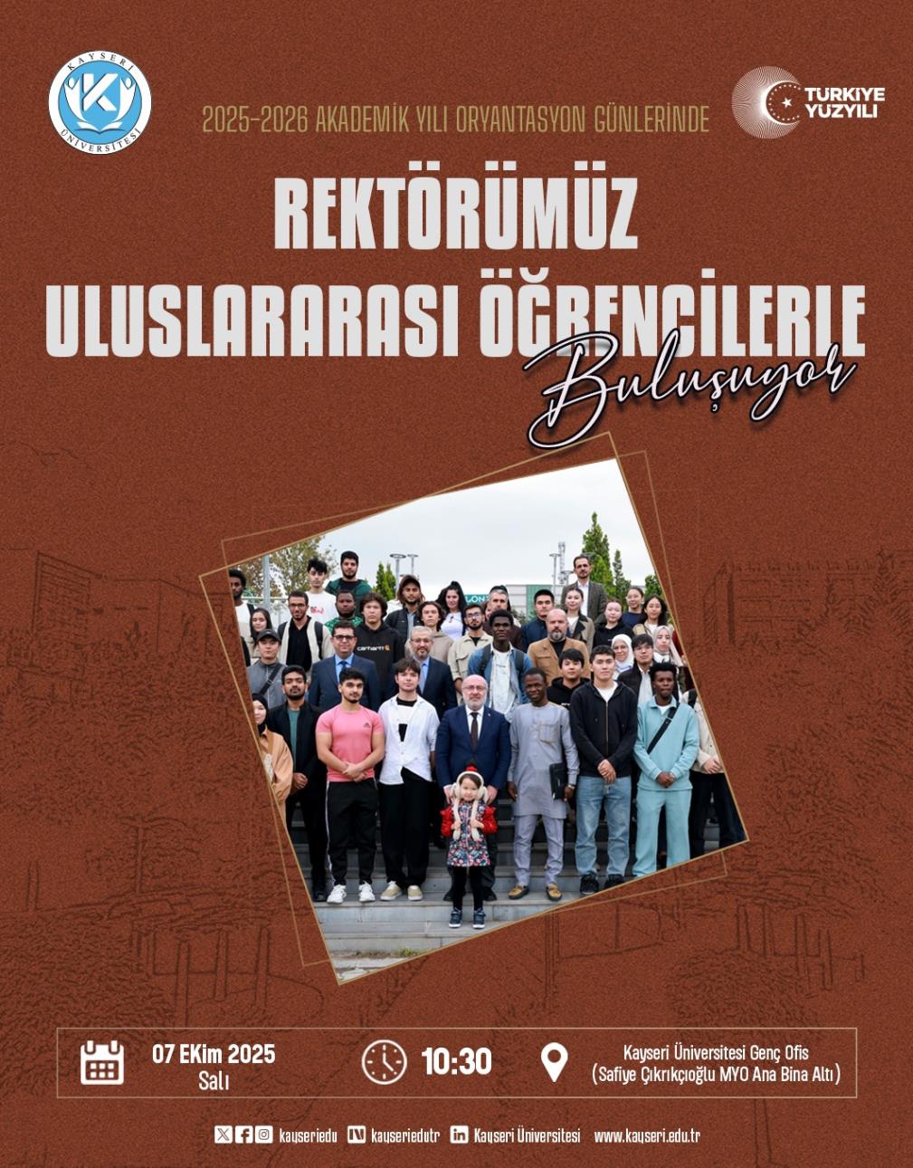 07 Ekim 2025 tarihinde düzenlenen Rektör-Yabancı Uyruklu Öğrenci Buluşması'na Öğrenci İşleri Daire Başkanlığı olarak katılım sağlayarak yabancı uyruklu öğrencilere Birimimiz hakkında bilgilendirme yapıldı