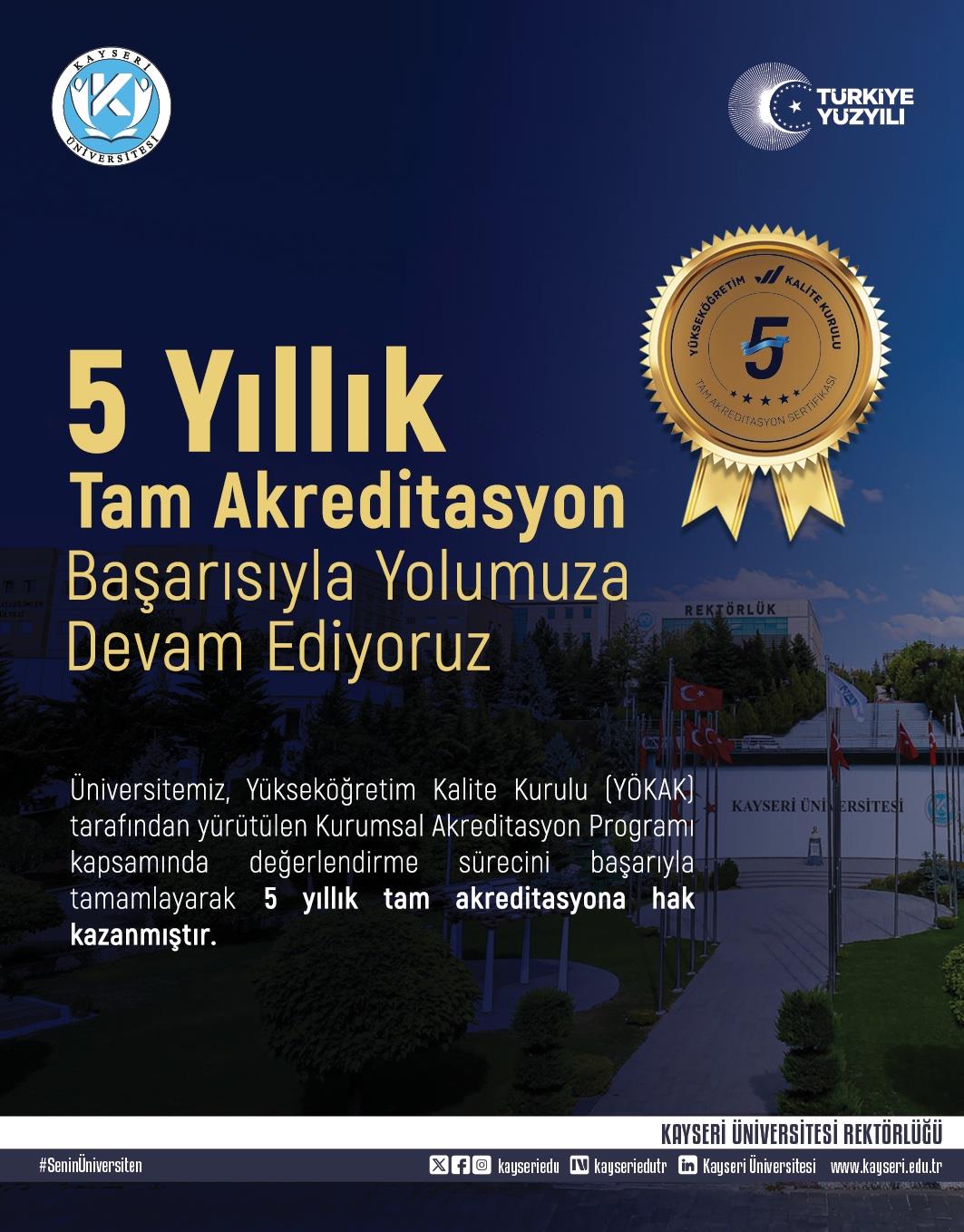 Üniversitemiz, Yükseköğretim Kalite Kurulu (YÖKAK) tarafından yürütülen Kurumsal Akreditasyon Programı kapsamında değerlendirme sürecini başarı ile tamamlayarak 5 yıllık tam akreditasyona hak kazanmıştır.